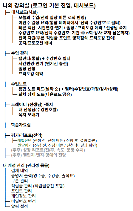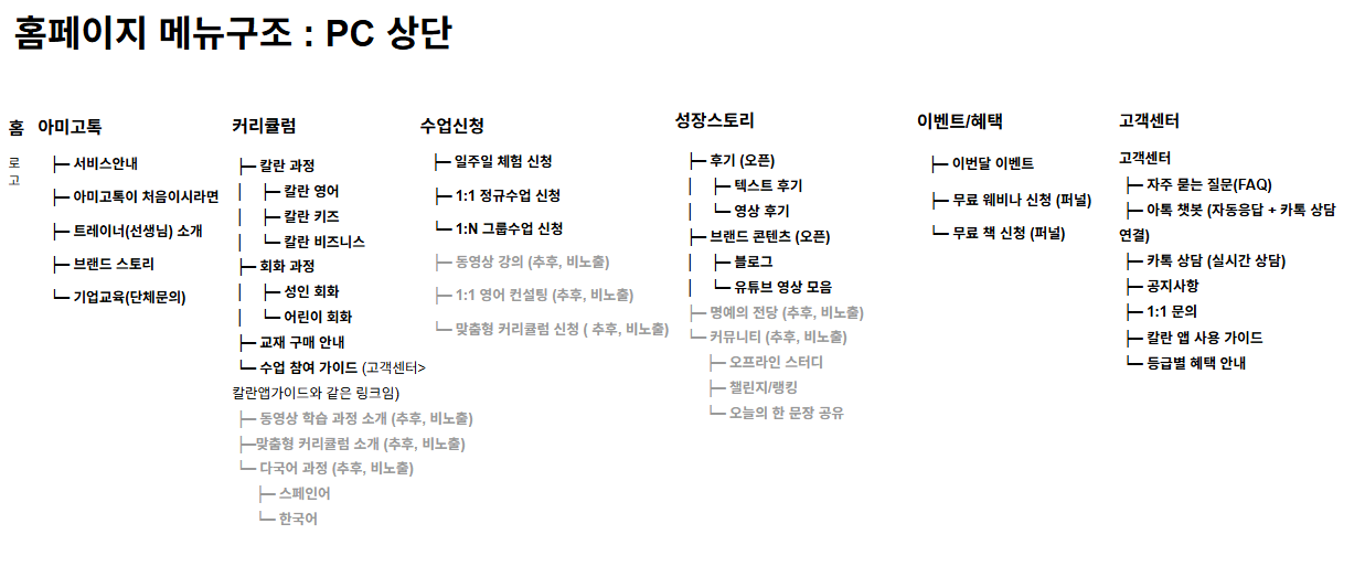 안녕하세요, 아미고톡 대표 변노을입니다. 현재 아미고톡 홈페이지는 개편을 준비 중입니다. 아직 완성된 것은 아니지만, 앞으로 약 2달 안에 새로운 구조로 바뀌게 될 예정입니다. 이 과정에서 제가 고민하는 부분들을 매일 기록하고 공유하려고 합니다. 아미고톡은 단순히 영어 수업을 제공하는 사이트가 아니라, **‘4배 빠른 영어 실력 향상’**이라는 철학을 담아내는 브랜드입니다. 그래서 이번 개편은 단순한 디자인 변경이 아니라, 학습자가 처음 방문 → 수업 신청 → 성장 확인 → 성취 축하까지의 여정을 끊김 없이 경험할 수 있도록 만드는 데 초점을 맞추고 있습니다. 우선 제가 구상한 상단 메뉴 구조는 다음과 같습니다. 현재 기획 메뉴 캡쳐 이미지